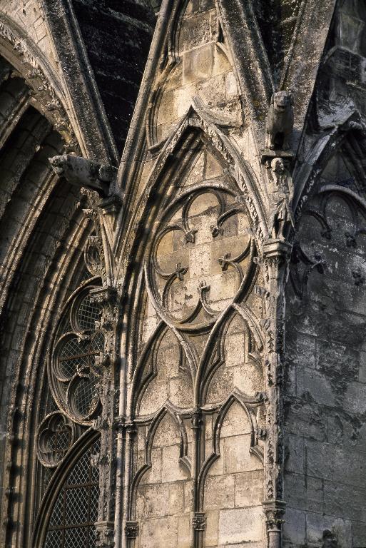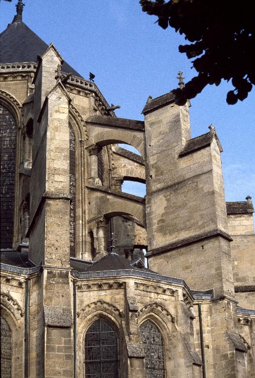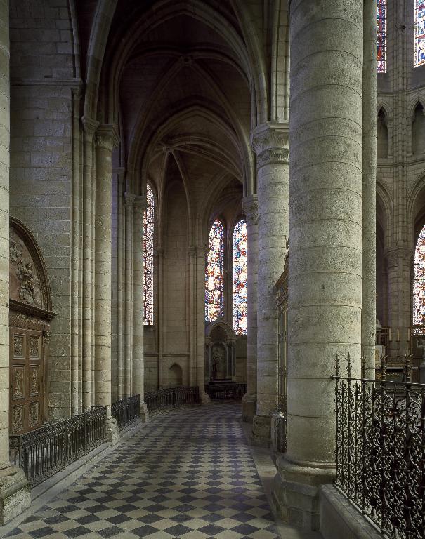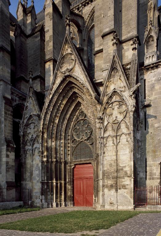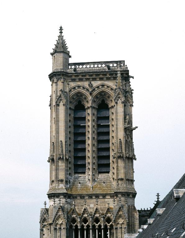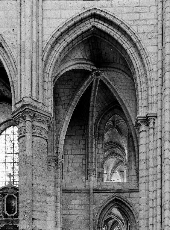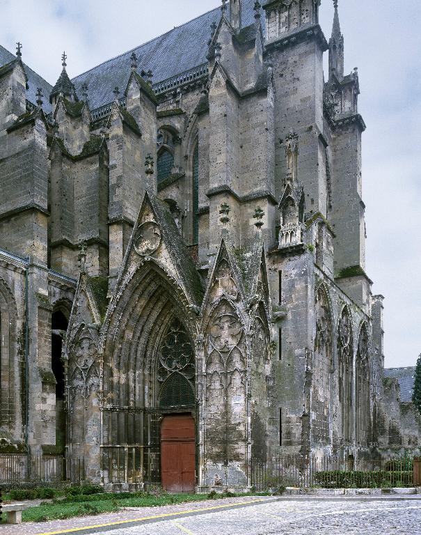 Enfin, le bras nord du transept est rebâti dans le quatrième quart du 13e siècle, comme en témoigne l’analyse dendrochronologique de sa charpente, qui propose les dates extrêmes 1282-1287 pour l’abattage des arbres. L’édification de la chapelle du Sépulcre, adossée à l’extérieur du mur-pignon nord de ce croisillon, appartient à cette campagne de travaux. Fondée en 1276 par le chanoine Renaud de Chézy, cette chapelle a été détruite au cours de la Révolution. Il n’en subsiste actuellement que les élégants remplages aveugles juxtaposés à l’extérieur du mur nord du transept.