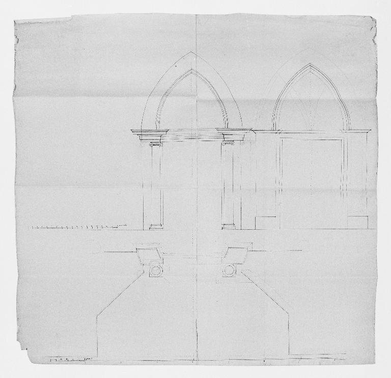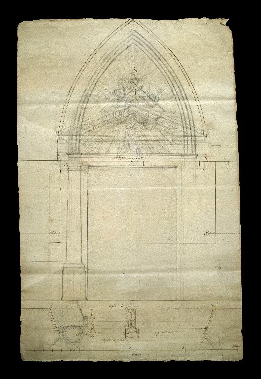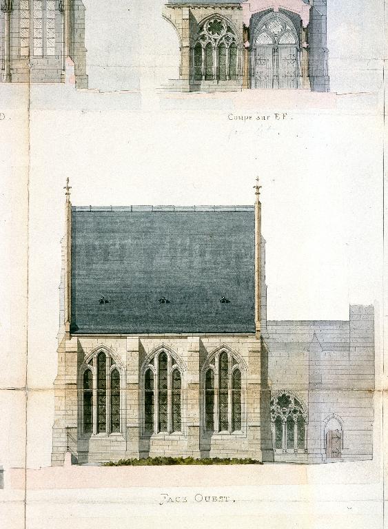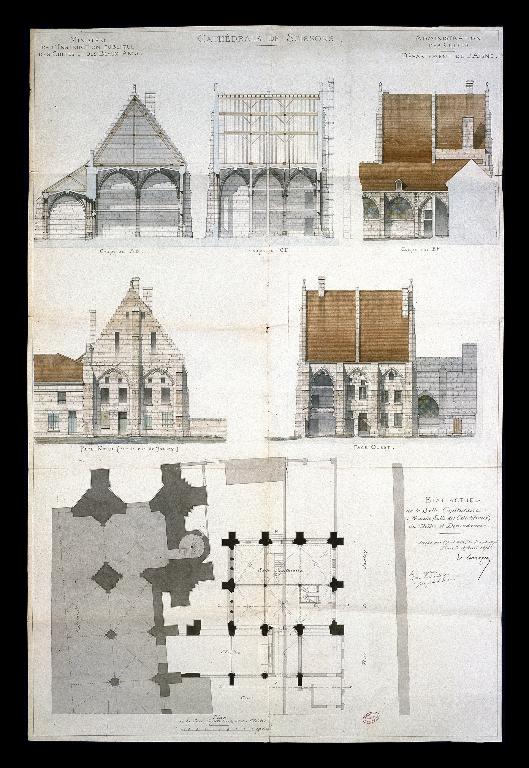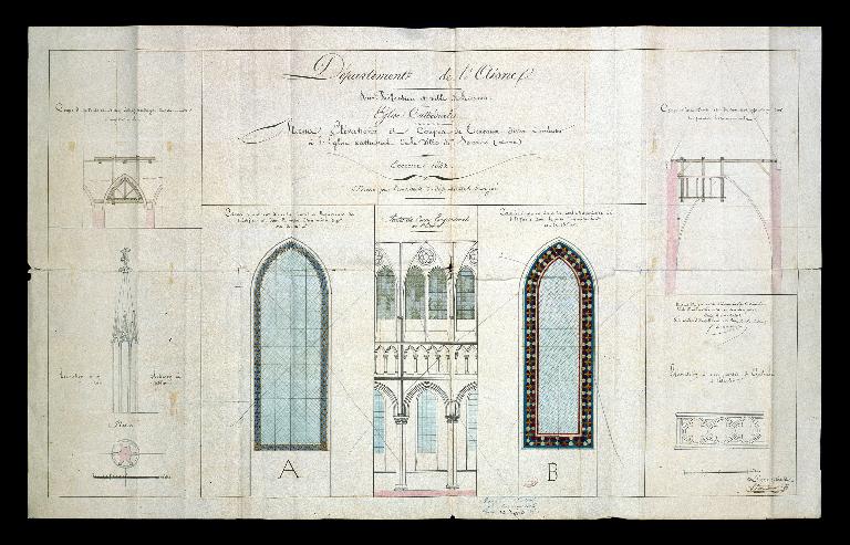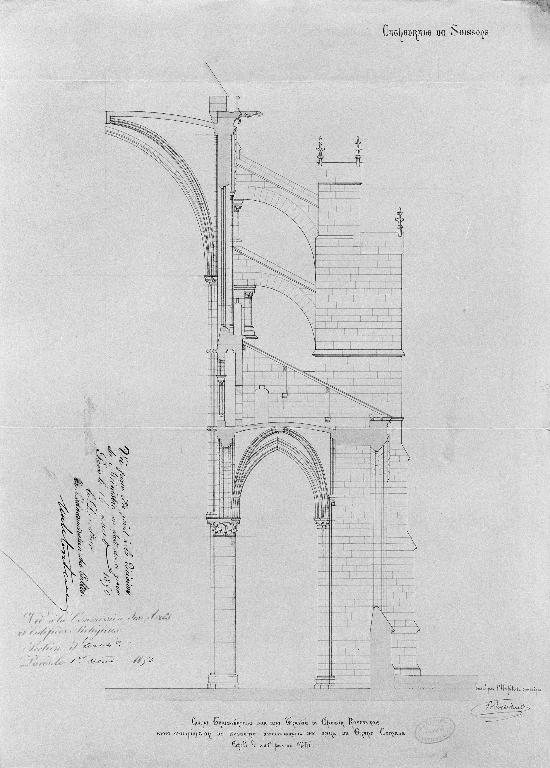 Plans Elévations et Coupes de Travaux divers à éxécuter à l'Eglise cathédrale de la ville de Soissons (Aisne). Exercice 1842. Dressé par l'architecte du département soussigné, dessin à l'encre aquarellé par Henri van Cléemputte, architecte départemental, [1842] (AN : F 19, carton 7887).
