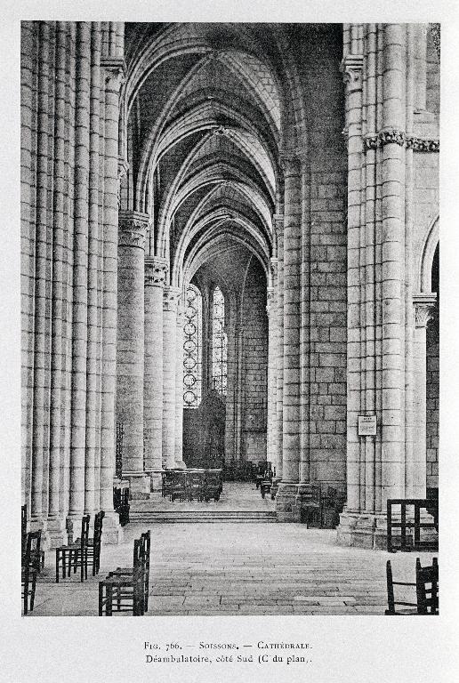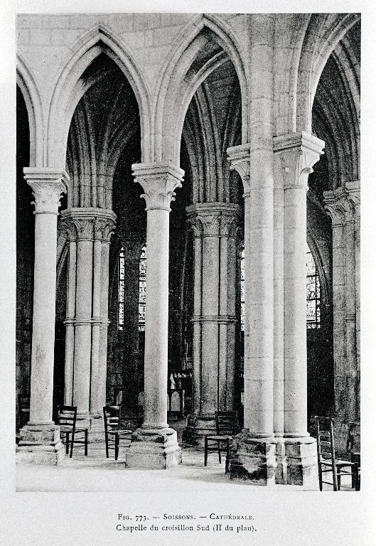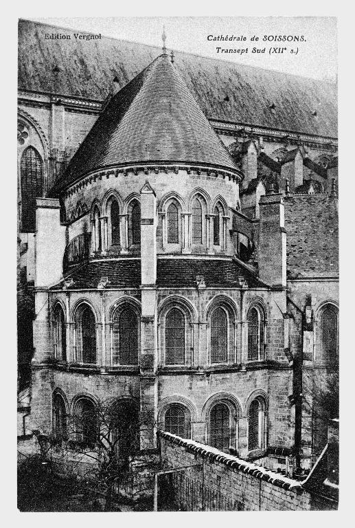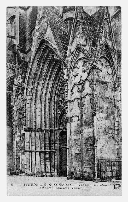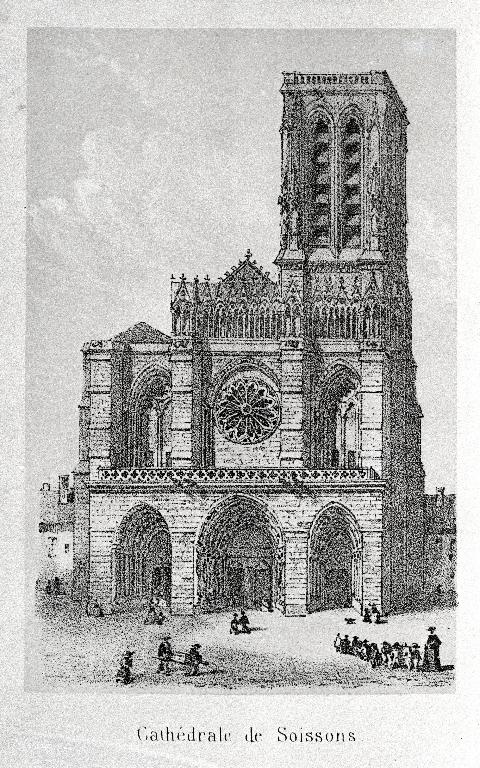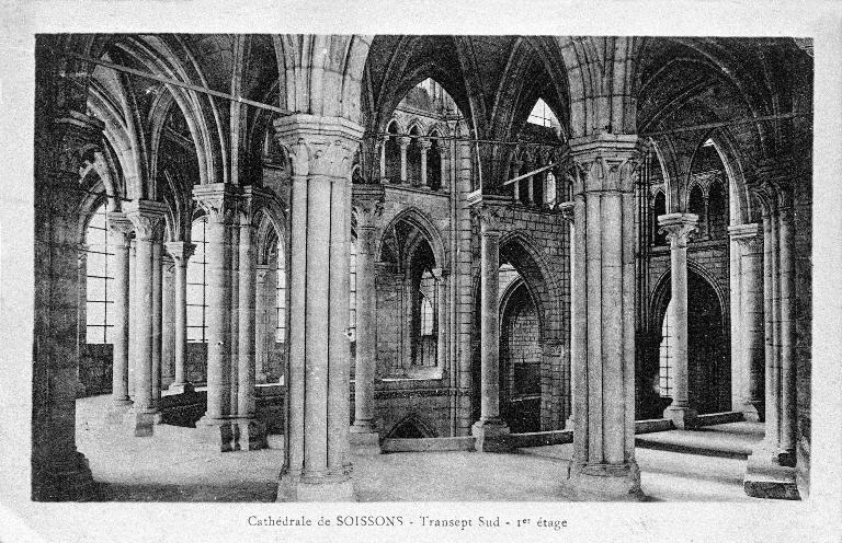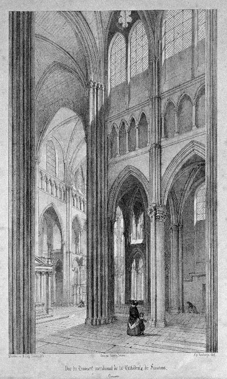 Vue du Transept méridional de la Cathédrale de Soissons. Picardie, dessin par Alphonse Baillargé, lithographie par Jules Monthelier et Eugène Cicéri, impression par Thierry frères, [vers 1840]. In : TAYLOR, Justin, NODIER, Charles, CAILLEUX, Alphonse de. Voyages pittoresques et romantiques dans l'ancienne France. Picardie. Paris : Firmin Didot frères, 3 volumes, 1835-1845.