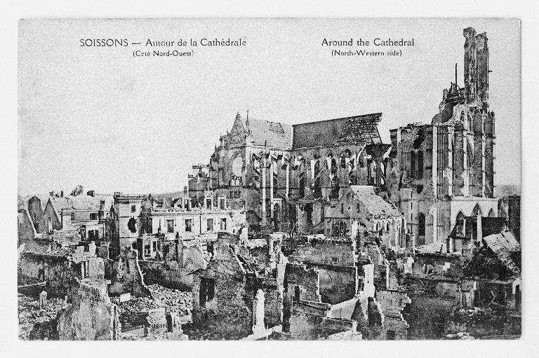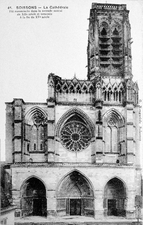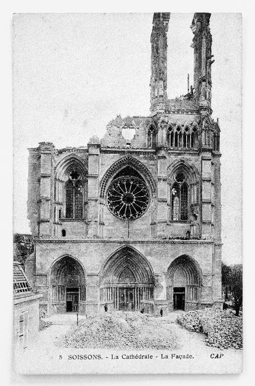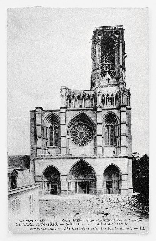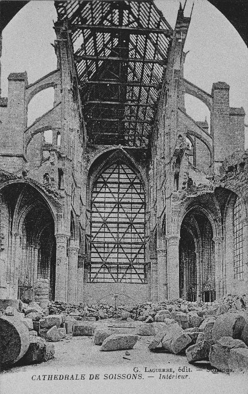 Peu après le déclenchement des hostilités en août 1914, la position des belligérants se stabilise dans les environs de Soissons, les Allemands occupant une position dominante au nord et à l'est de la ville. Pendant toute la guerre, la cathédrale demeure une cible privilégiée de l'armée ennemie, sous le prétexte fallacieux qu'elle sert de poste d'observation ou en représailles pour les échecs subis. Durant les premiers mois du conflit, l'artillerie allemande n'endommage que la toiture, les verrières de la cathédrale, et l'ancienne salle capitulaire ou chapelle des Œuvres. Puis, sous l'intensification des bombardements, les deux premières travées du mur nord et une colonne de la nef s'écroulent en février 1915. Les arcs-boutants ne peuvent supporter longtemps la partie correspondante de la voûte qui s'effondre le 2 mars, sur une surface de 200 m². Au cours des semaines suivantes, les projectiles atteignent le haut de la tour sud, ébranlant la voûte dont les pierres continuent à se détacher. L'architecte Émile Brunet, appelé à prendre des mesures de préservation, ne peut qu'ordonner la dépose des verrières, l'évacuation des œuvres d'art les plus précieuses et la protection du mobilier intransportable par un amoncellement de sacs de plâtre et de ciment. Les intempéries de l'hiver 1915-1916, en désagrégeant les pierres, aggravent les effets de la fureur dévastatrice des hommes. Le 31 janvier 1916, une nouvelle partie de la voûte de la nef s'écroule, laissant maintenant à ciel ouvert l'ensemble du vaisseau depuis l'orgue jusqu'à la chaire.