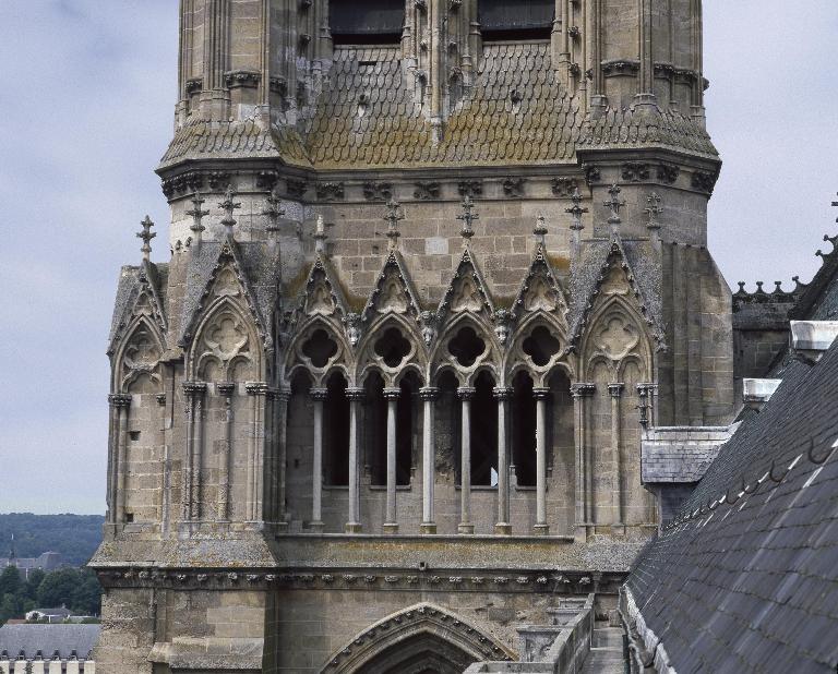La fin du 12e siècle se révèle favorable à la poursuite du chantier. Le monument, qui en était dépourvu, est alors doté d’un transept édifié sur quatre niveaux, dont subsiste actuellement le bras sud. Le terrain sur lequel s’élèvent ce croisillon et la chapelle attenante est offert par l’évêque Nivelon de Quierzy, postérieurement à son accession à l’épiscopat en 1176. La fondation en 1190 par Raoul de Braine de la chapellenie Saint-Jacques dans la chapelle supérieure qui ouvre sur les tribunes, fournit une indication sur le proche achèvement de cette construction.