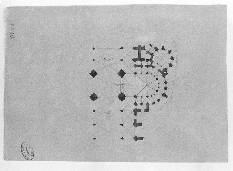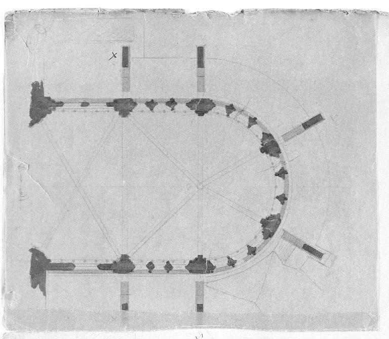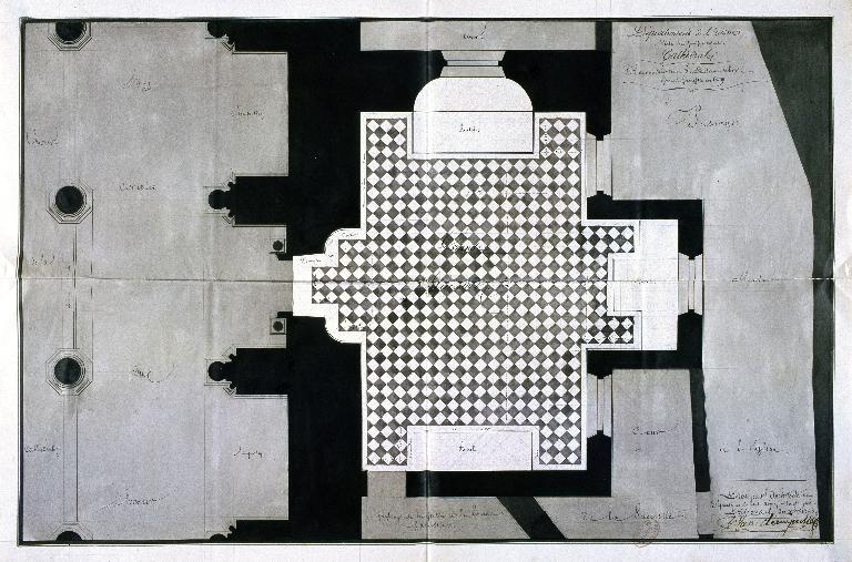 Diocèse de Soissons. Cathédrale. Plan, dessin à l'encre aquarellé, par Émile Boeswillwald, architecte diocésain, 1850 (AN : F 19 7887).