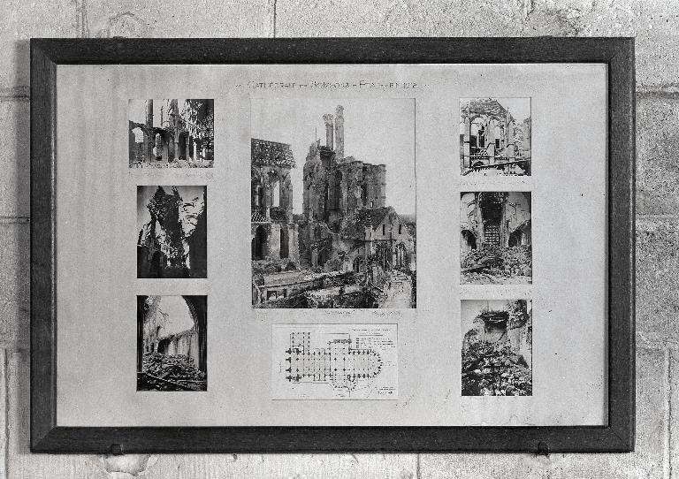 À l'occasion d'un déplacement de la zone de combats en 1917, Brunet propose, à la demande de l'évêque, des travaux urgents de clôture pour pouvoir rendre au culte le chœur avec ses chapelles ainsi que le transept, moins atteints et plus facilement réparables que la nef. Puis au début de l'année suivante, il projette de poursuivre ces mesures par la consolidation des parties conservées de la nef, maintenant séparée du transept par un mur. Mais le retour des combats à partir de mai 1918 réduit à néant les mesures prises et accroît encore la dégradation du monument. À l'issue du conflit, la cathédrale en ruines, criblée d'impacts et de brèches, a perdu sa couverture et sa vitrerie. La nef, presque entièrement détruite sur trois travées, est dépourvue de ses voûtes et d'une partie de ses arcs-boutants. La tour sud, fissurée, est privée de son beffroi. Enfin le sol entier de l'édifice est recouvert d'un amoncellement de gravats qui atteignent, par endroits, plus de cinq mètres de hauteur.