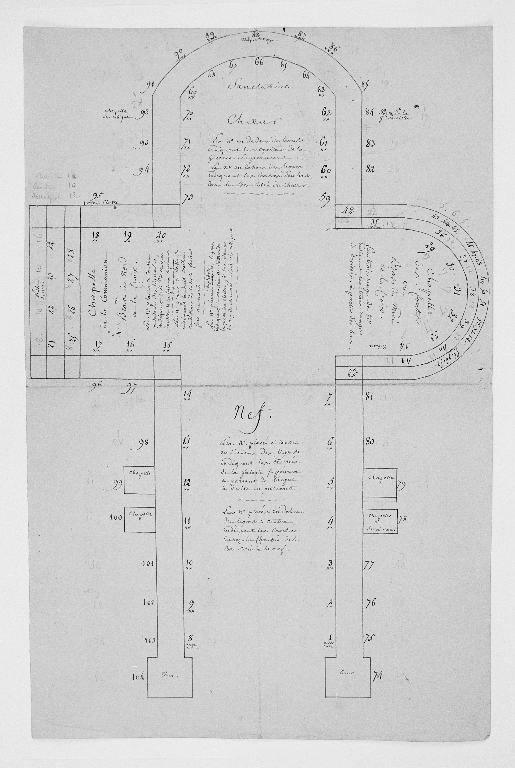 [Plan de la cathédrale de Soissons avec l'emplacement des verrières], 2 dessins à l'encre sur papier par Louis Dumanceau-Duroché (?), architecte du département de l'Aisne, [1815] (A Evêché Soissons : 6 L Soissons 1815-1818).