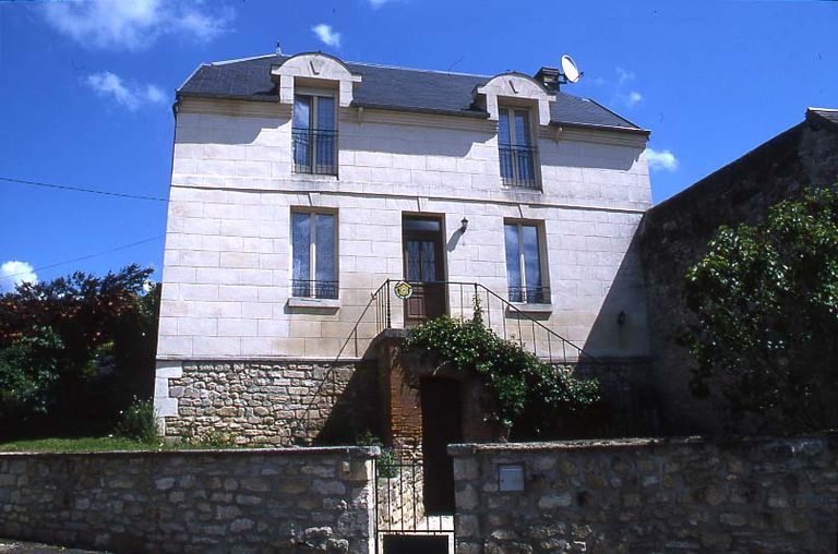 Construite sur un tertre, cette maison fait face à la mairie. Distribué par un escalier à deux révolutions, le rez-de-chaussée surélevé atteste la présence d'une cave haute, accessible par une porte extérieure. Le soubassement est constitué d´un blocage de moellons de calcaire ébauchés en petit appareil. Le mur de façade est en pierre de taille formant appareillage réglé. Les élévations secondaires, supportées par des chaînages harpés en pierre de taille, sont construites en blocage de moellons à joints pleins gris. Une chaîne horizontale sur bandeau, présente uniquement en façade, souligne la limite entre rez-de-chaussée et premier étage. Deux lucarnes à fenêtres pendantes à fronton arrondi animent le toit à longs pans et demi-croupes en ardoise synthétique.