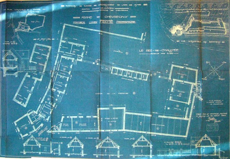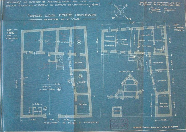 Dommages de guerre, ferme de Chevregny, plan, par Munier et Schuster architectes, 23 septembre 1920 (AD Aisne : 15 R 1742 / 7450).