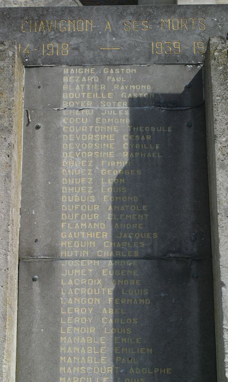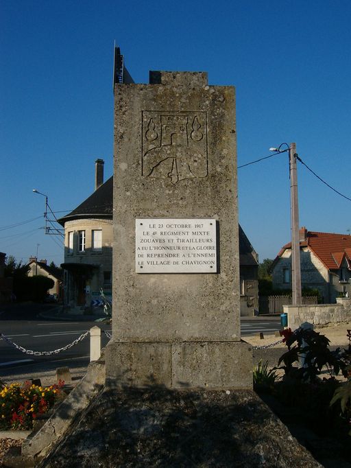 La commune d'Haïphong, marraine de Chavignon, offrit à sa filleule en juin 1931 une somme de 1000 francs en vue de l'érection de son monument aux morts, également financée grâce à une souscription lancée auprès des habitants du village, le complément étant à la charge de la commune. Exécuté à la demande des sections d´anciens combattants de Chavignon par Ravert, marbrier à Pinon, qui fournit la pierre et réalisa les inscriptions, et Henri Albert Lagriffoul, sculpteur à Paris, qui effectua la sculpture des deux grands motifs, le monument aux morts fut inauguré le 1er octobre 1933. Les travaux de maçonnerie du soubassement furent assurés par Albert Lanthony, entrepreneur local. Le monument est également dédié aux victimes de la Seconde Guerre mondiale.