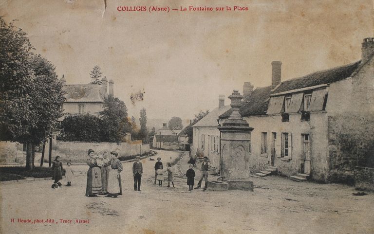 Colligis (Aisne) - La fontaine sur la place, carte postale, par H. Houde photographe, début 20e siècle (AP).