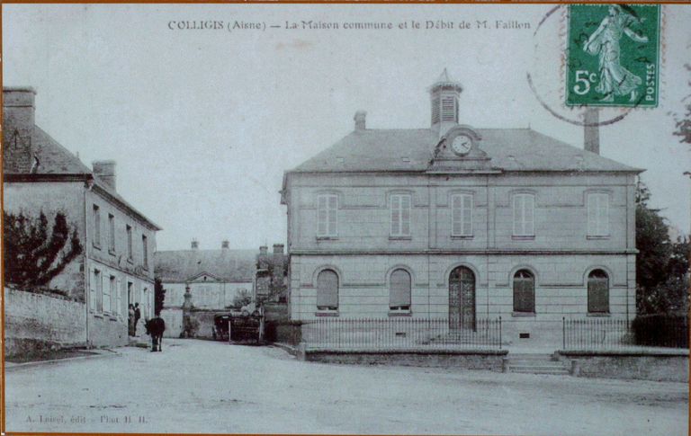 Colligis (Aisne) - La maison commune et le débit de M. Faillon, carte postale, par H. Houde photographe, début 20e siècle (AP).