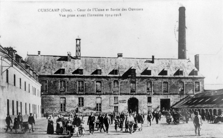 Ourscamps (Oise). Cour de l'Usine et sortie des Ouvriers, carte postale, avant 1914-1918 (AP).