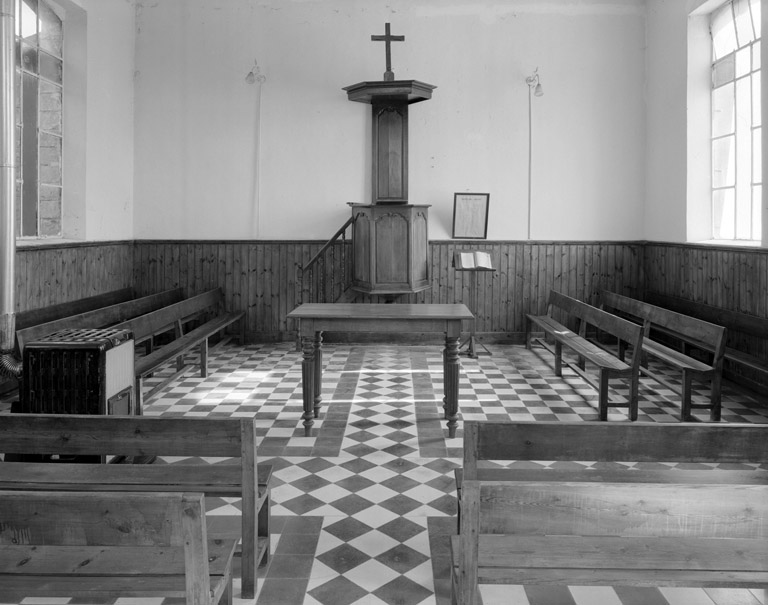 Le temple est un édifice rectangulaire en briques sur solin de grès, couvert en ardoise et ardoise synthétique. Sa toiture est dissymétrique : une croupe à l'ouest, un toit à longs pans et pignon découvert à l'est. On accède à l'intérieur du temple par un porche néo-classique en pierre, portant l'inscription : A ceci tous connaîtront que vous êtes mes disciples, si vous avez de l'amour les uns pour les autres (Jean 13 : 35). Au nord se trouve une sacristie en briques, couverte de tuiles, avec une cheminée. L'intérieur du temple, très sobre, ne porte aucun décor.