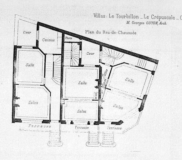 Villas Le Tourbillon, Le Crépuscule, Clair de Lune à Mers-les-Bains, plan du rez-de-chaussée, d'après Georges Guyon architecte. In : Villas et cottages des bords de la mer. Façades, intérieurs, plans. Paris : Charles Schmid, [ca 1910], 87 pl.