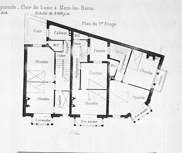 Villas Le Tourbillon, Le Crépuscule, Clair de Lune à Mers-les-Bains, plan du premier étage, d'après Georges Guyon architecte. In : Villas et cottages des bords de la mer. Façades, intérieurs, plans. Paris : Charles Schmid, [ca 1910], 87 pl.