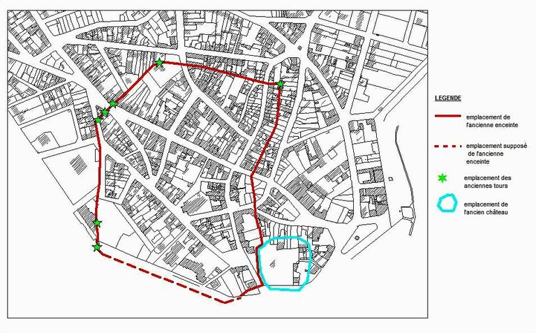 Le château, fondé à partir du 8e siècle est fortifié à partir de 1340 : il se composait d'un donjon avec quatre tours rondes. De ces systèmes défensifs il ne reste rien, hormis quelques pans de l'ancienne enceinte urbaine [fig. 1, 2, 20]. La population du chef-lieu se concentre dans cet espace clos, où un incendie détruit 64 maisons en 1799.