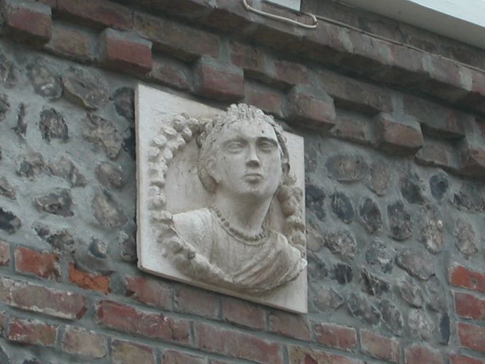 Les bandeaux horizontaux en brique sont doublés d'une frise de céramique. Une tête de femme sculptée est apposée sur la façade latérale droite.