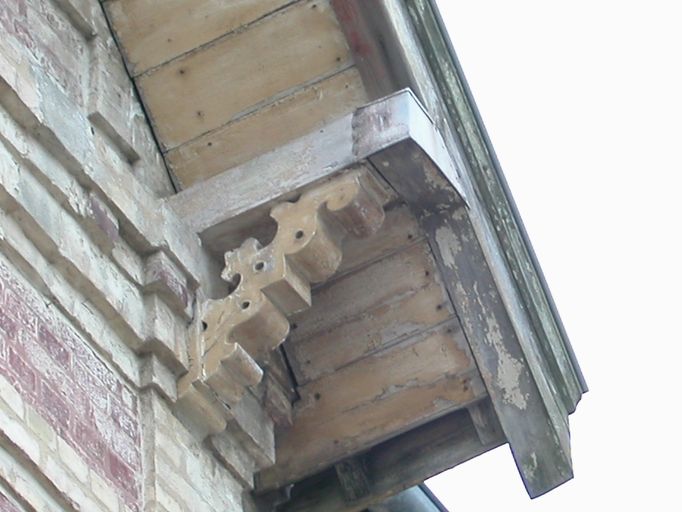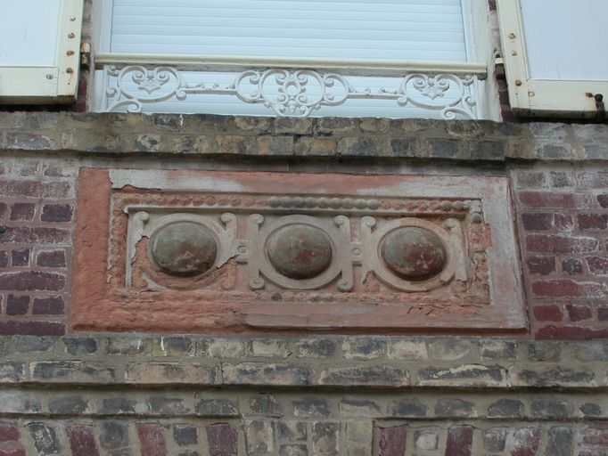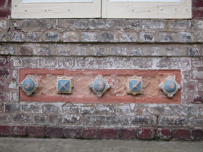 Des frises de céramique actuellement fortement dégradées agrémentent les panneaux d'allège. La travée de droite présente une polychromie décorative grâce à l'emploi alterné d'assises de briques de couleur ocre et rouge. La brique ocre est aussi utilisée pour les chaînes d'angle.