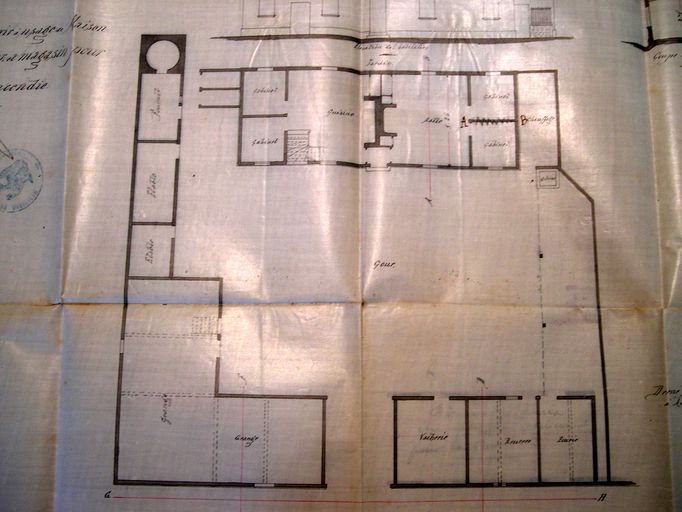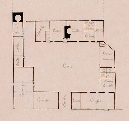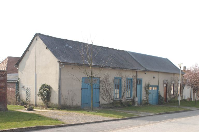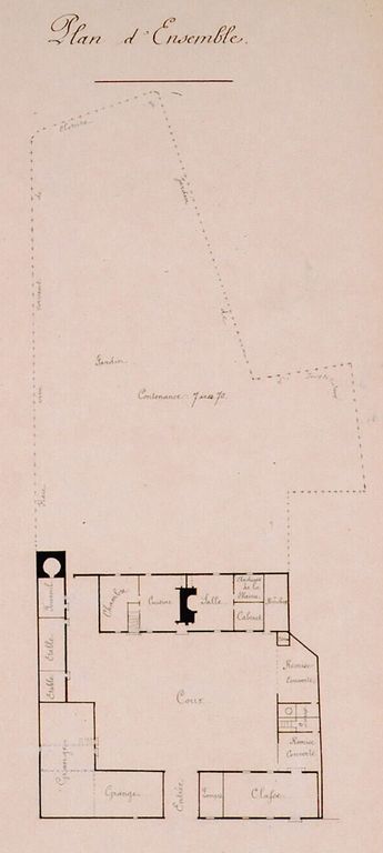 En 1866, la commune fait l´acquisition d´une maison, qui pouvait servir de logement pour l'instituteur, de salle de mairie et d'archives communales, de salle de classe et de remise pour les pompes. L'édifice se composait d'un corps de logis entre cour et jardin et de vastes dépendances, visibles sur le plan des bâtiments existants en 1866. Le grand bâtiment en L comprenait vacherie, resserre et écurie, au sud du portail, granges, étables et fournil, au nord, suivant une disposition partiellement conservée sur le plan de 1878 (doc. 3). Une cave est visible sous l´une des granges. Le logis comprend une cuisine, une salle et quatre cabinets, petites pièces latérales sans feu, ouvrant sur la salle et la cuisine. Un escalier à retour donne accès au comble ; une porte, au nord, donne accès à la cave.