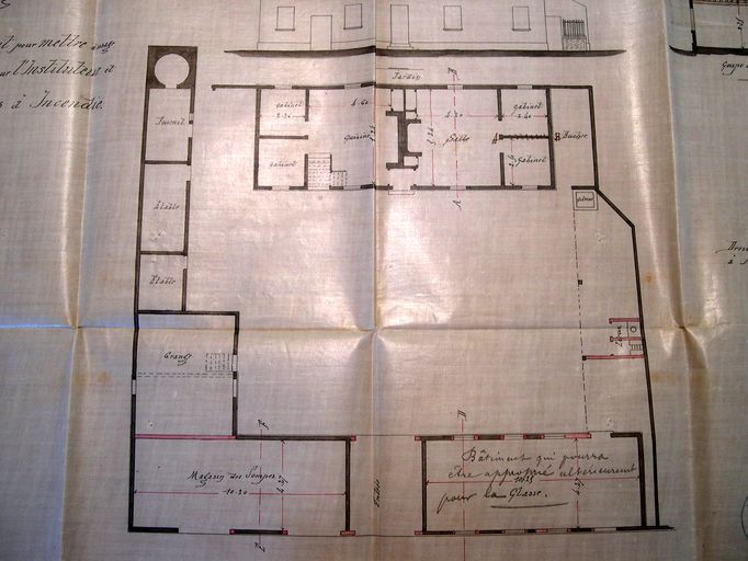 Le plan d´aménagement, dressé par l'architecte Antoine en juin 1866, prévoit d´aménager le local des pompes à incendie dans la grange située au nord du portail, avec l´ouverture de deux grandes portes cochères, et une salle de classe, au sud, éclairée par une porte et trois fenêtres à l´est et à l´ouest. Il est approuvé l´année suivante par le ministère de l'Instruction publique qui accorde une subvention à la commune.