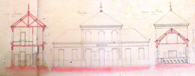 Commune Tully. Plan et coupe transversale de l'école-mairie, dessin, M. Legrand, 1860 (AD Somme ; 99 O 1886).