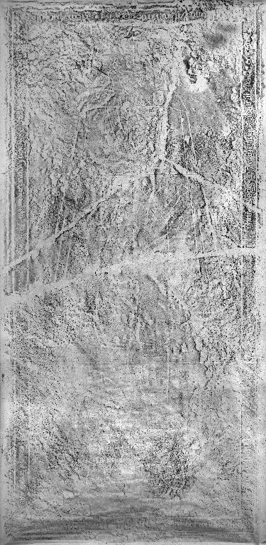 - calcaire, blanc, monolithe taillé, poli, gravé, décor à relief gravé, décor dans la masse, impastation