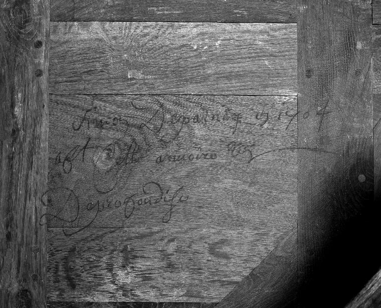 Le menuisier a également signé et daté son ouvrage, à l'intérieur du tiroir inférieur, demandant en outre aux religieux qui utiliseraient ce chapier de prier pour son fabricant après sa mort. La différence d'orthographe du patronyme, entre la pièce d'archive (Despernay) et la signature (Deparnay), est un phénomène habituel en cette époque où l'orthographe des noms propres n'est pas stabilisée.