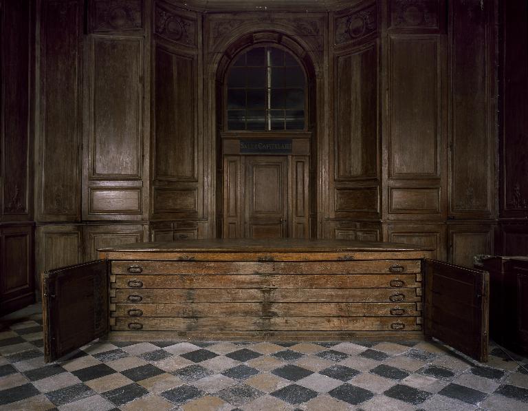 Le 29 juillet 1704, le chapitre passe un marché avec le menuisier soissonnais Simon Despernay pour la réalisation d'une "grande armoire pour les chapes" destinée à la grande sacristie, moyennant 340 lt. Le jour suivant, un nouveau marché est passé avec le maître serrurier Antoine Bequeret, pour les ferrures du même chapier. Le résumé synthétique de ces contrats, qui figure dans l'inventaire des papiers du chapitre dressé à la fin du 18e siècle, est suivi d'un commentaire précisant que ce chapier est conforme à celui de Reims, "et même avec quelque chose de mieux".