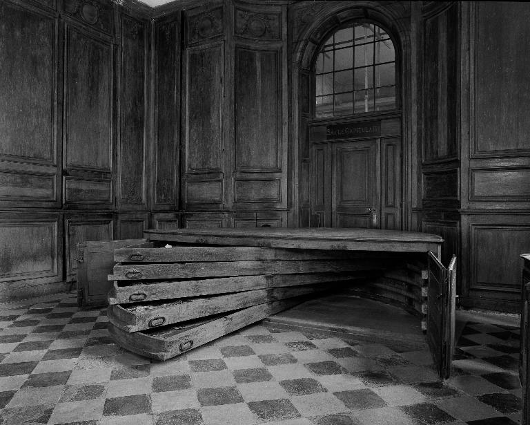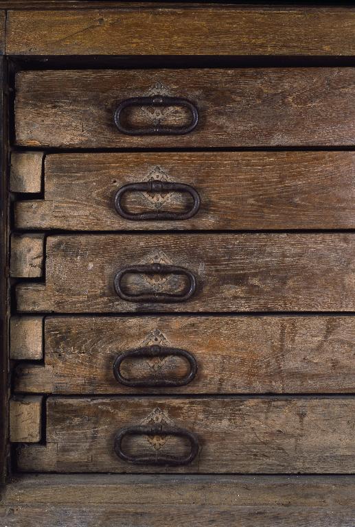 L'ouverture de ces tiroirs d'une grande lourdeur est facilitée par un système en forme de petit escabeau en chêne, à sept marches. Les cinq marches inferieures comportent une ouverture centrale, chemisée de métal, destinée à accueillir une roulette amovible que maintient une tige métallique, elle-aussi mobile. La roulette, placée à la bonne hauteur, permet à chaque tiroir de pivoter plus aisément et lui sert de point d'appui une fois qu'il est totalement ouvert.