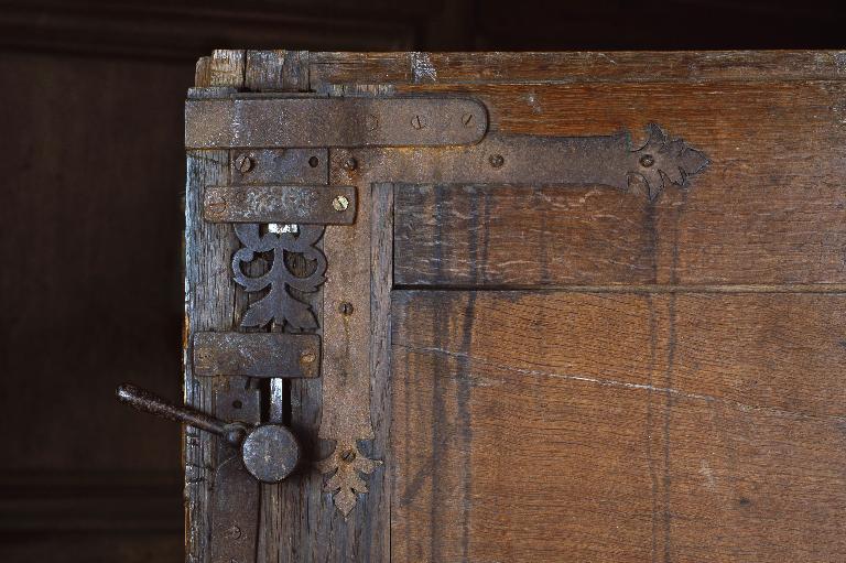 Le fer forgé ou découpé est utilisé pour les poignées ou anneaux de tirage des tiroirs et leur platine, pour les équerres renforçant les assemblages des battants et enfin, pour les verrous à tige de ces derniers.