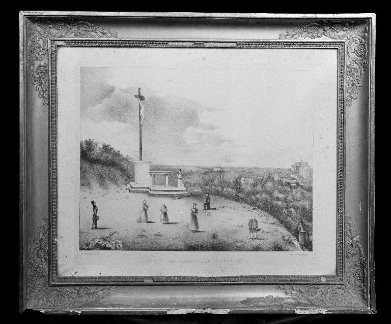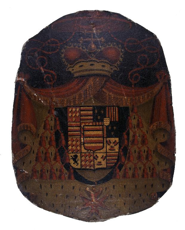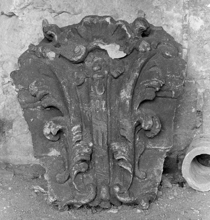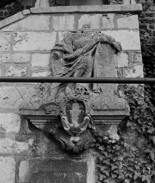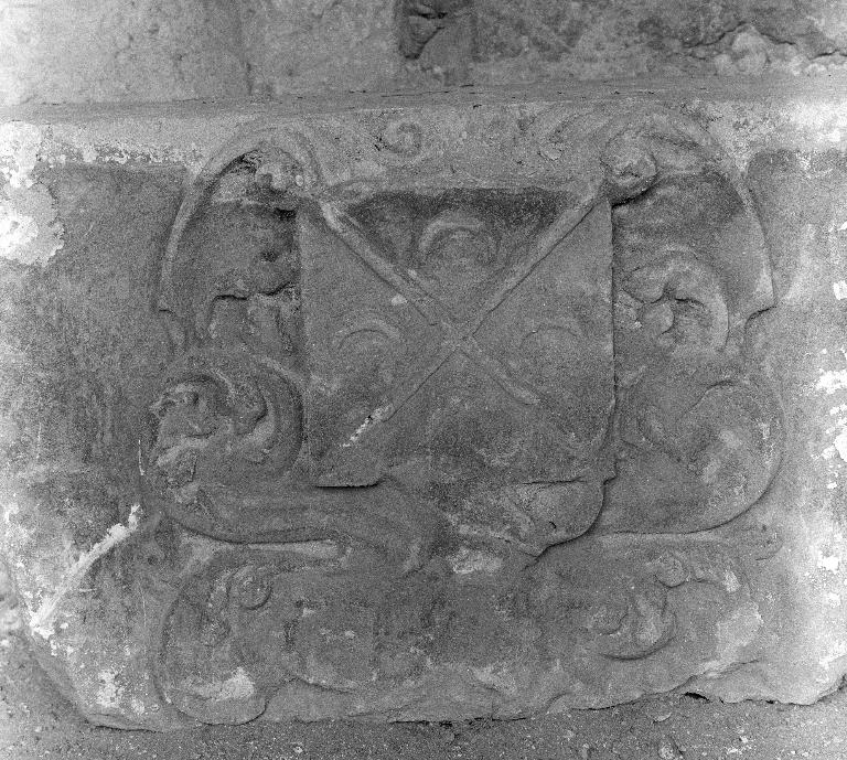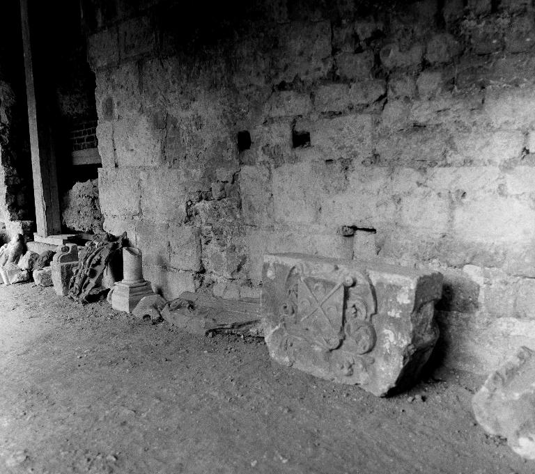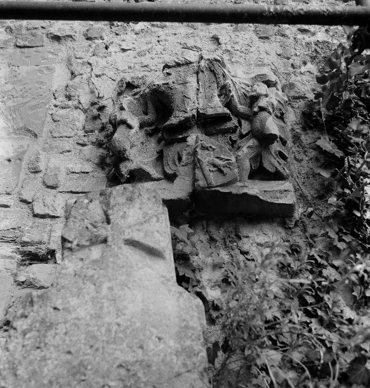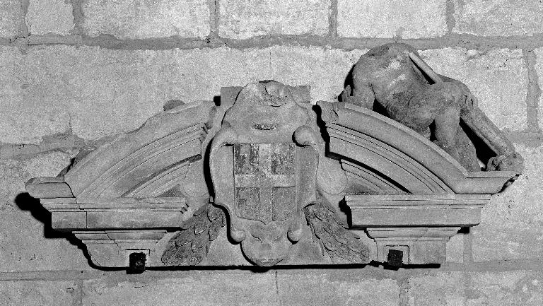 - Tombeau, (fragment), fronton brisé, statuettes couchées, armoiries.