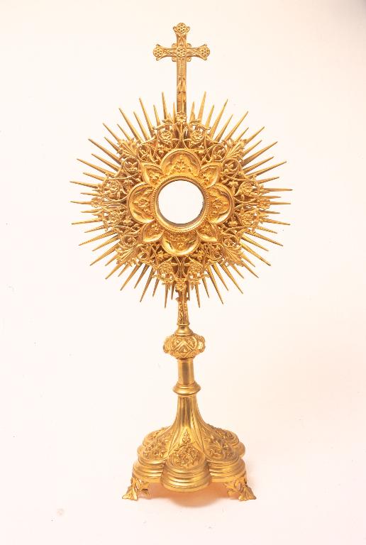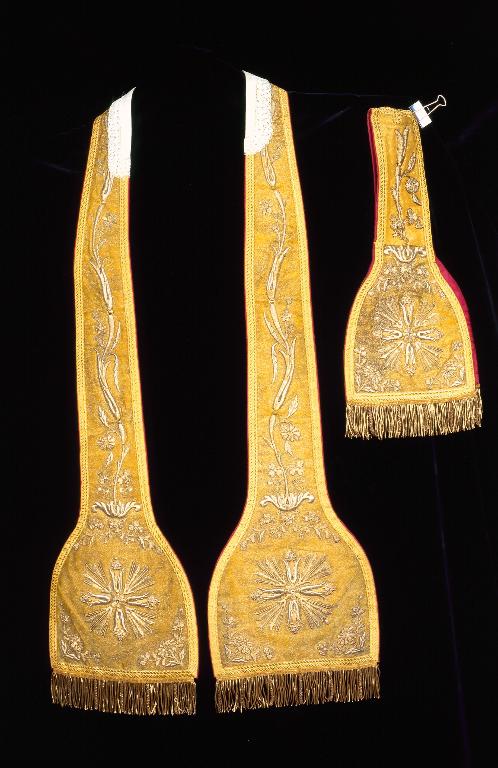 - Ensemble n° 15, ornement blanc, voile, étole, manipule, passementerie dorée, 19e siècle.