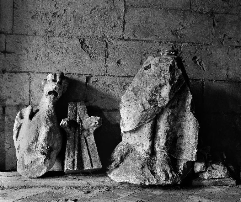 - Tête de chien ou de dragon, calcaire, traces de polychromie, 15e siècle. - Tête d'ange, céramique, Greber, Beauvais, 20e siècle.