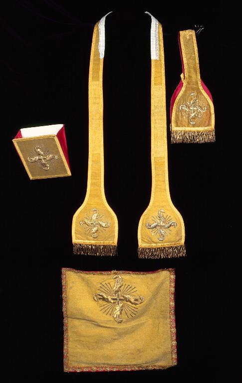 - Ensemble n° 7, ornement doré, soie brochee or, motif surligné de rouge, voile de calice, étole, manipule et bourse du corporal, 19e siècle.
