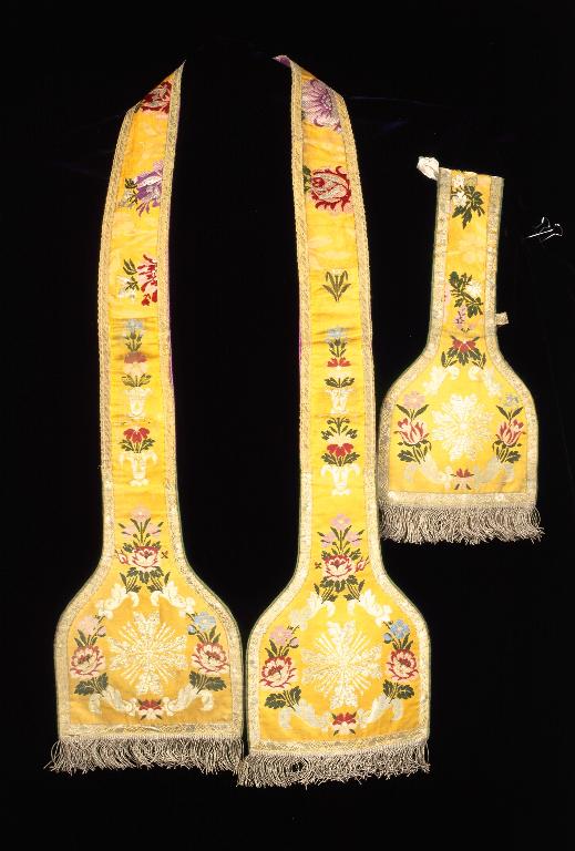 - Ensemble n°16, ornement blanc, bourse, voile, étole, manipule, soie damassée, broderie au petit point, 19e siècle.