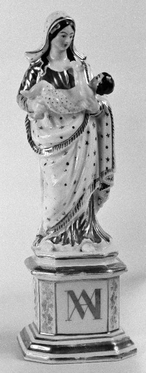 - Statuette, Vierge à l'Enfant, porcelaine blanche, peint or, marque : CG, C et croix sous le socle ; h = 33, la = 11, pr = 9, 19e siècle.