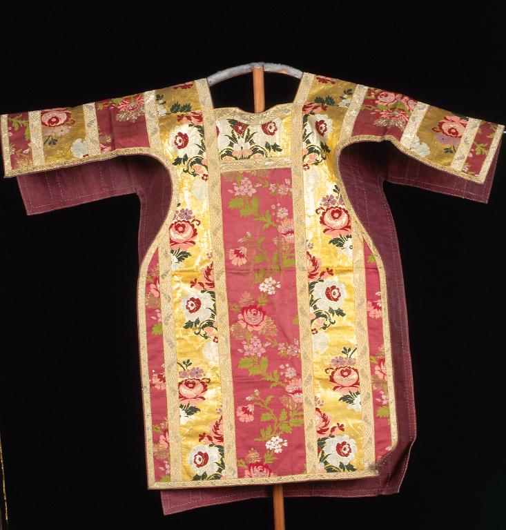 - Pièce rectangulaire, dessus d'autel (?), soie rouge, brochée or et argent motifs de palmes et de grandes fleurs, doublure de soie verte, P cousu en initiale à l'intérieur, 18e siècle.
