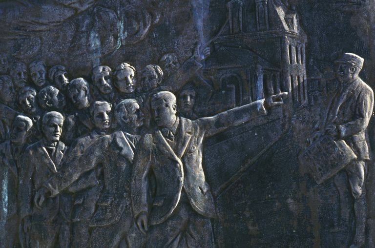 A l'appel du tambour, une foule d'hommes se mobilise, entraînée par une allégorie de la Patrie dans une nuée. Dans le fond : représentation de la mairie de Long.