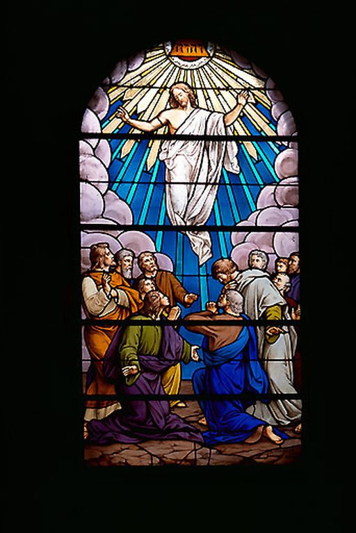 Ensemble de trois verrières : Ascension du Christ, Calvaire, Apparition de la Vierge à Bernadette Soubirous (baies 1, 2, 6),