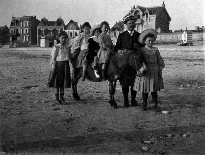 Promenade à dos d'âne sur la plage du Crotoy, photographie noir et blanc, 1903 (coll. part.).Immatriculation