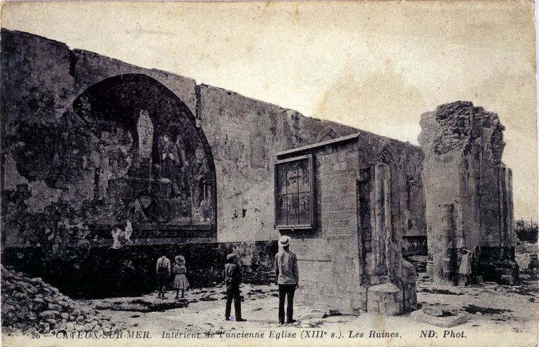 Vue intérieure des ruines de l'ancienne église paroissiale de Cayeux-sur-Mer (détruite) et des peintures murales, carte postale, 1er quart 20e siècle (coll. part.).Immatriculation