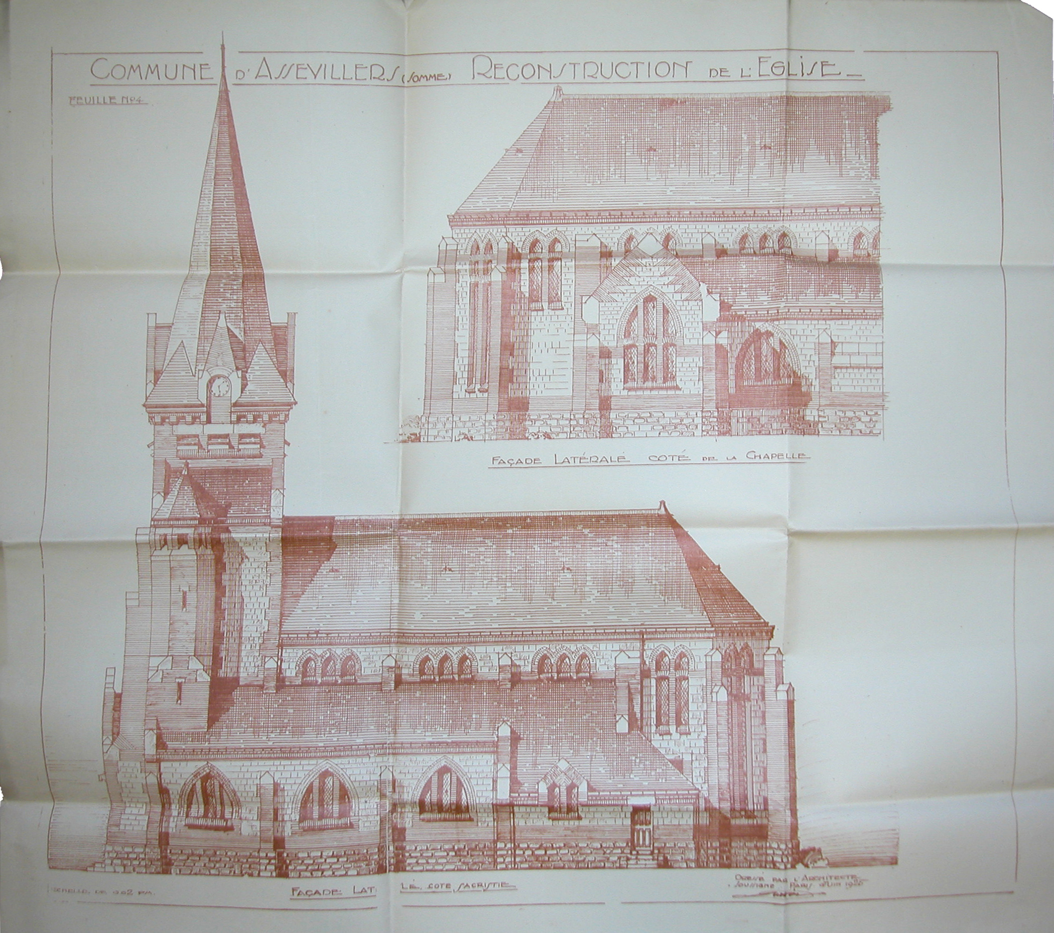 Projet de reconstruction de l'église : façades latérales, feuille 4, Louis Duthoit, juin 1925 (AD Somme ; 10 R 140).Immatriculation