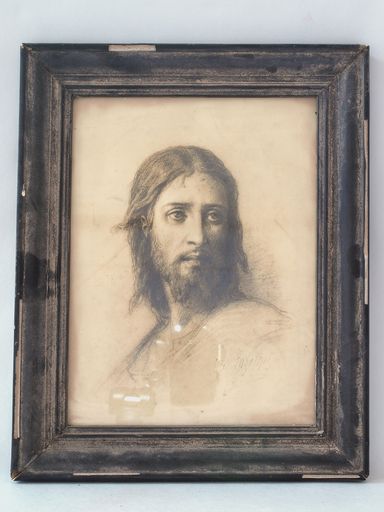 Estampe (?), dessin (?). portait du Christ de trois-quart, en noir et blanc, signé Lazerquet (?)Immatriculation