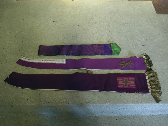 3 étoles ; 1 violette et 1 pastorale violette et verte ; 1 pastorale rouge et verte ; 20e siècleImmatriculation