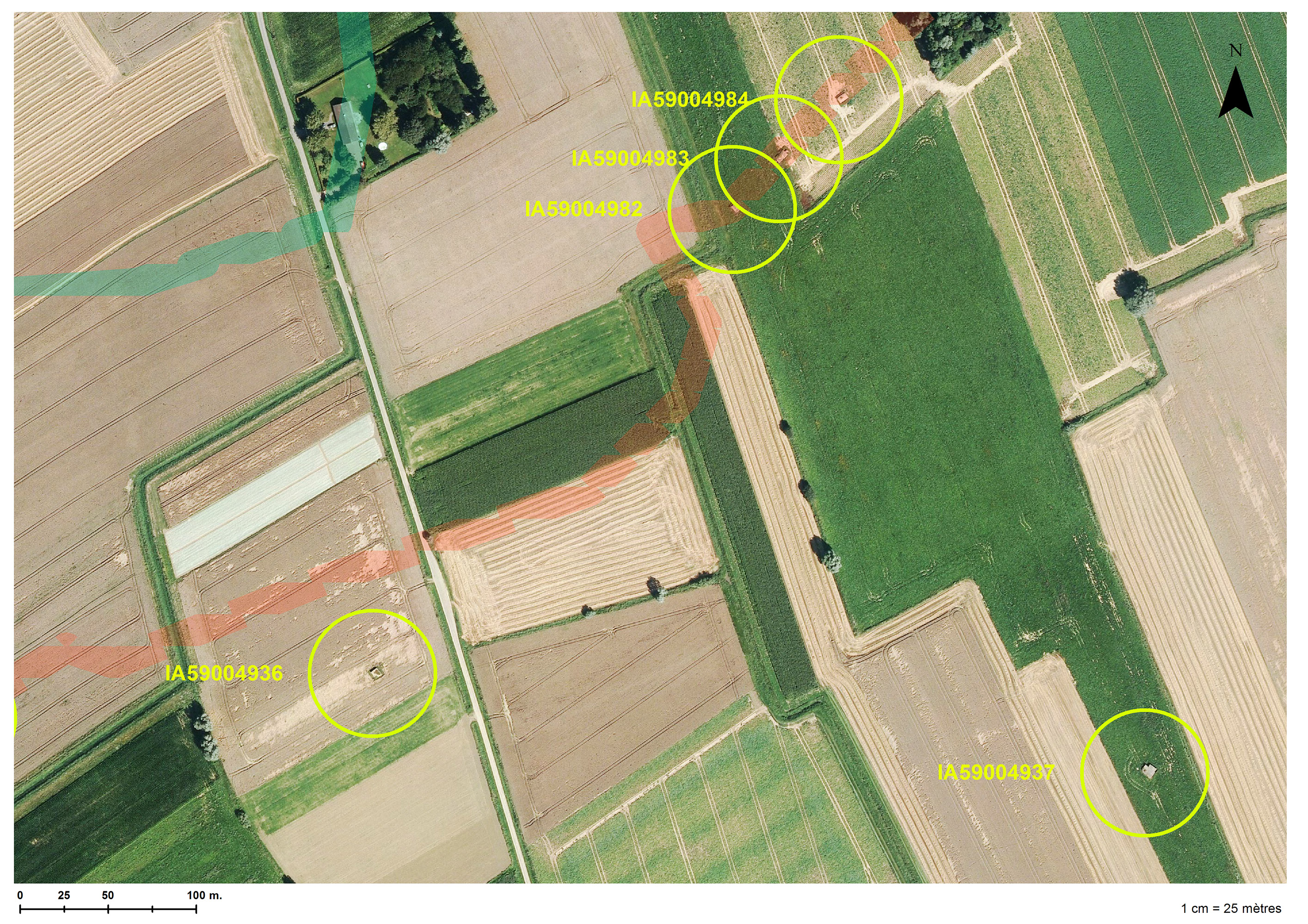 Situation de l'édifice (en bas à gauche) sur une photographie aérienne de 2015. Ont été rappelées, en rouge, la première ligne allemande, en vert la première ligne britannique.Immatriculation